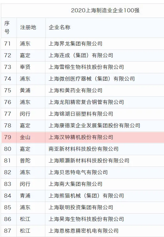 2020年8月18日由上海市企業(yè)聯(lián)合會、上海市企業(yè)家協(xié)會、上海市經(jīng)濟(jì)團(tuán)體聯(lián)合會和解放日報社聯(lián)合主辦的“2020上海制造業(yè)企業(yè)100強(qiáng)”發(fā)布。漢鐘精機(jī)榮獲“2020上海制造業(yè)企業(yè)100強(qiáng)”稱號。